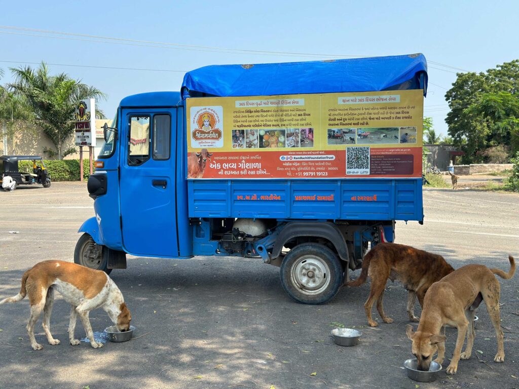 At Shree RamRachit Foundation Trust, we believe no living being should go hungry. That’s why, 365 days a year, we deliver nourishing meals to street dogs in these remote areas. With your support, we can continue to make a difference and bring a glimmer of hope to their lives.